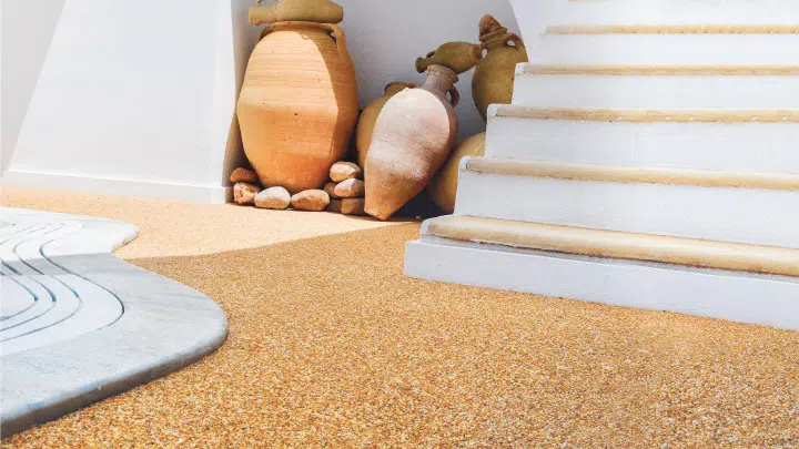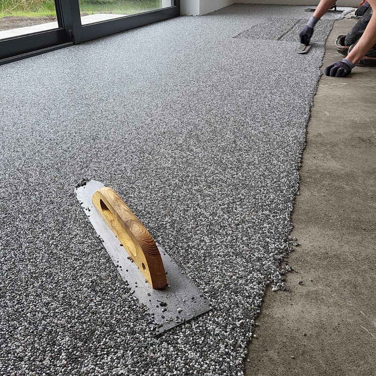 It is defined as a composite material poured in place or precast, consisting of marble chips and/or other aggregates combined within a binder material, which is ground and polished to a beautiful finish. Epoxy Terrazzo uses an epoxy matrix to bind the aggregates and is one of the best thin-set systems.